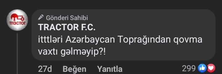 "Football-plus.az" xəbər verir ki, Cənubi Azərbaycan təmsilçisi bu barədə "feysbuk" hesabında paylaşım edərək bu sözləri yazıb: "Qarabağ Azərbaycandı!". İtləri Azərbaycan torpağından qovma vaxtı gəlməyib?!".